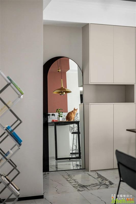 入戶加入1600*350mm收納柜,同嚴肅神秘的黑框鏡面與暖灰柜面碰撞,產(chǎn)生一系列的情感反差。地面進行斜面分割,異形魚骨拼木紋磚交錯寒江雪大理石地磚,張弛有度,彰顯活力個性的同時讓整體空間更富有藝術感。