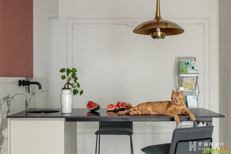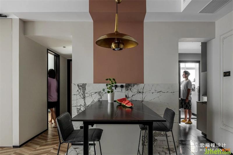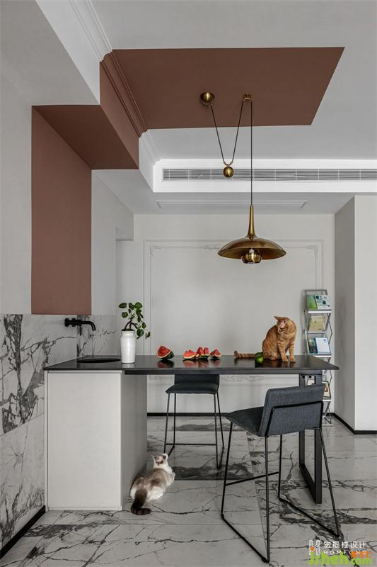 偶爾從部隊回家休息時,屋主會做一些輕食簡餐,所以餐廳空間設(shè)計為中島(帶水盆)+高臺面。滿足生活需求的同時去制造區(qū)別與傳統(tǒng)設(shè)計的反差感。從左側(cè)墻體延伸的畫眉鳥棕色塊作為餐廳區(qū)域的中心元素,在視覺上強調(diào)區(qū)域性,背景墻設(shè)計為角花造型石膏線,富有西式色彩文化,并與客廳墻面串聯(lián)呼應。