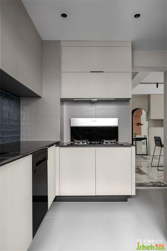 原始存在的戶型問題讓餐廳、廚房的采光受到影響,所以在成都裝修設(shè)計時將生活陽臺與廚房只用玻璃推拉門隔開,并取消廚房門的使用,讓更多的光線照射進來。在功能使用上,聯(lián)通的空間還可以交替使用,生活陽臺也幫忙容納了一部分廚房電器。