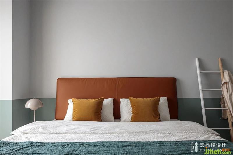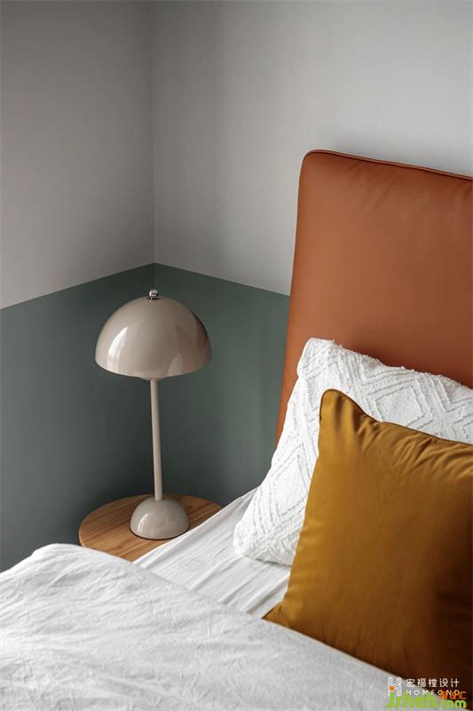 皮革棕、灰綠色、蒸汽灰三色的搭配,簡潔有力,制造出如云般的輕柔舒適感。床頭的一側(cè),是丹麥的Flowerpot燈,它能在任何空間條件下創(chuàng)造出安靜又時髦的氛圍。