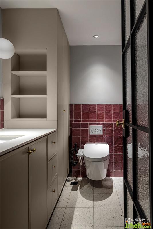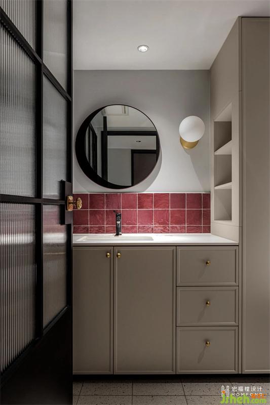 原始衛(wèi)生間無獨立窗戶和干濕分區(qū),借臨近次臥1.5m2讓其功能完善。黃銅、藝術(shù)玻璃、絳紫色小磚、以及延續(xù)入戶風格的鏡面,層疊有致,用一系列精心的細節(jié),將復古與現(xiàn)代進行融合。