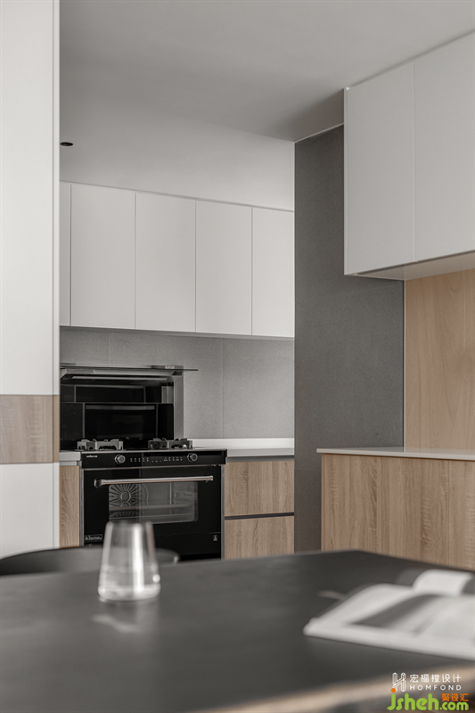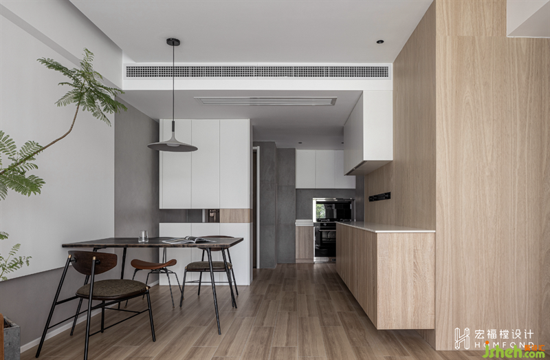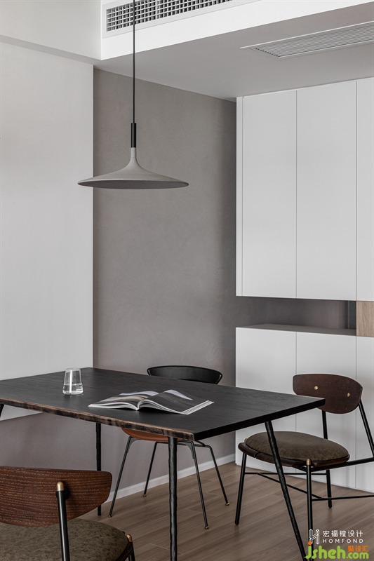 延伸至餐廳墻面的灰色藝術(shù)涂料與客廳的白色墻體交匯,營造出隨性自在的氛圍感。它與玄關(guān)、中西廚以一種近乎有序的方式鏈接了起來,而橡木自然邊餐桌,點(diǎn)綴了秩序之中的靈動(dòng)力。