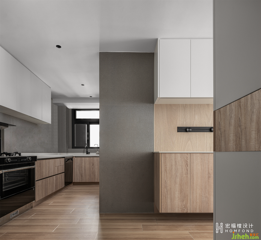 走廊舍棄多余的裝飾,家居設(shè)計(jì)通過材料、形式、光線的均衡融合營造出舒心的平靜力。