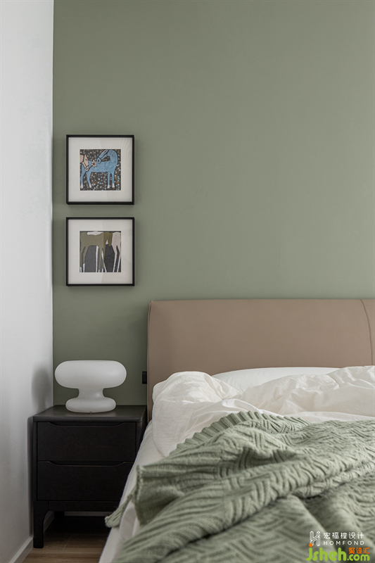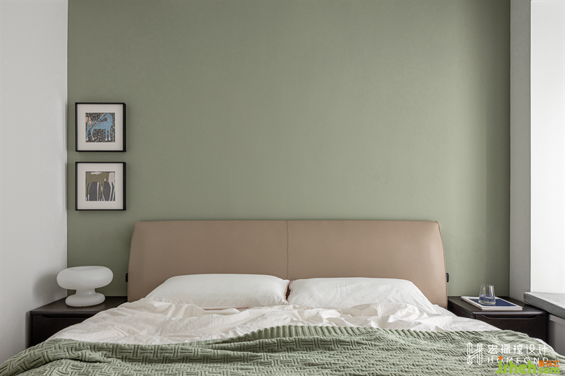 強(qiáng)調(diào)寧靜自在的舒緩感受力,主臥大面積使用了灰綠色作為空間主調(diào),并與奶油色混合搭配,提升空間格調(diào)外,又帶有一絲生機(jī)與從容感。