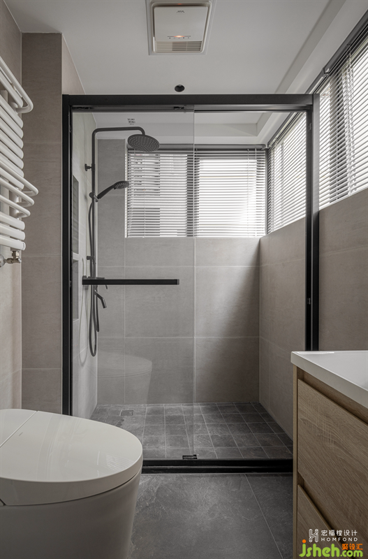 選擇磨砂質(zhì)感的沙色瓷磚,沉浸舒緩的力量,恰到好處的賦予空間足夠的溫度。日光透過90度玻璃窗進(jìn)入室內(nèi),與自然產(chǎn)生鏈接,明亮通透。