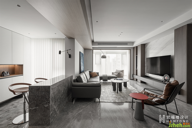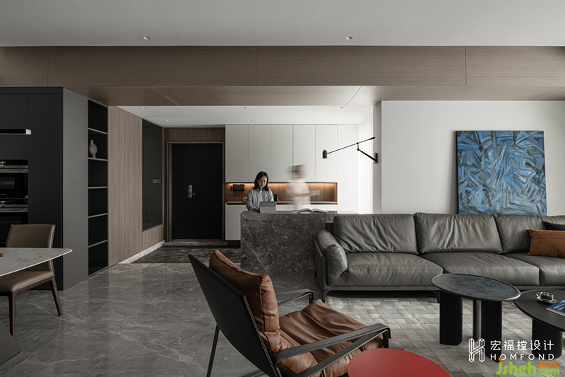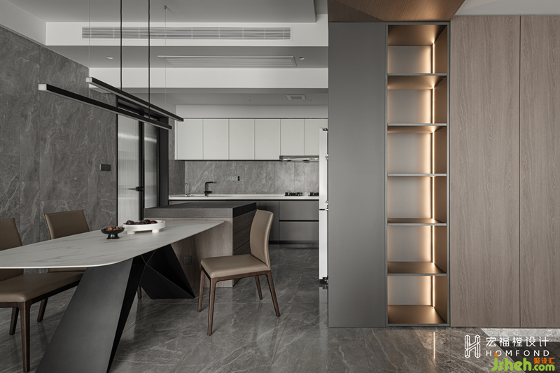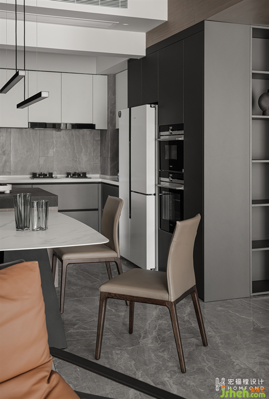 經(jīng)由邏輯設(shè)計的色彩配搭,更更容易把控整體調(diào)性。第一層,暖灰亮面磚過渡到鯨魚灰石材串聯(lián)至上恢復(fù)暖白天花;第二層,鯨魚灰地柜過渡到象牙白吊柜;第三層,黑白灰家具為主,點綴淺灰褐,盡顯優(yōu)雅、精致的空間質(zhì)感。