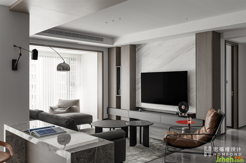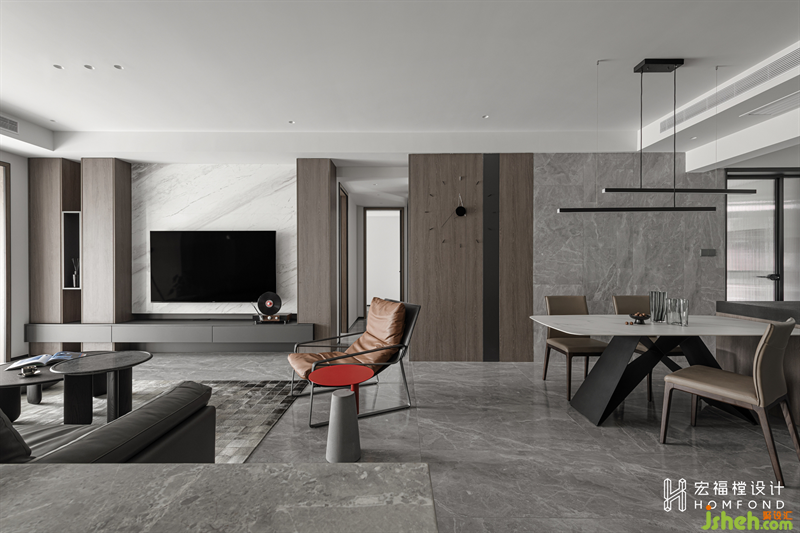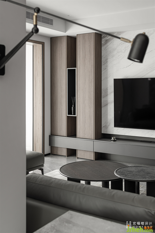 電視墻通過“粗細線條”橫豎向切分形成色塊把兩側(cè)空間變得很碎,而中間空間則設(shè)計為一個整體顯得很粗。粗粗細細的線條交叉感,賦予空間形態(tài)更多可能性。