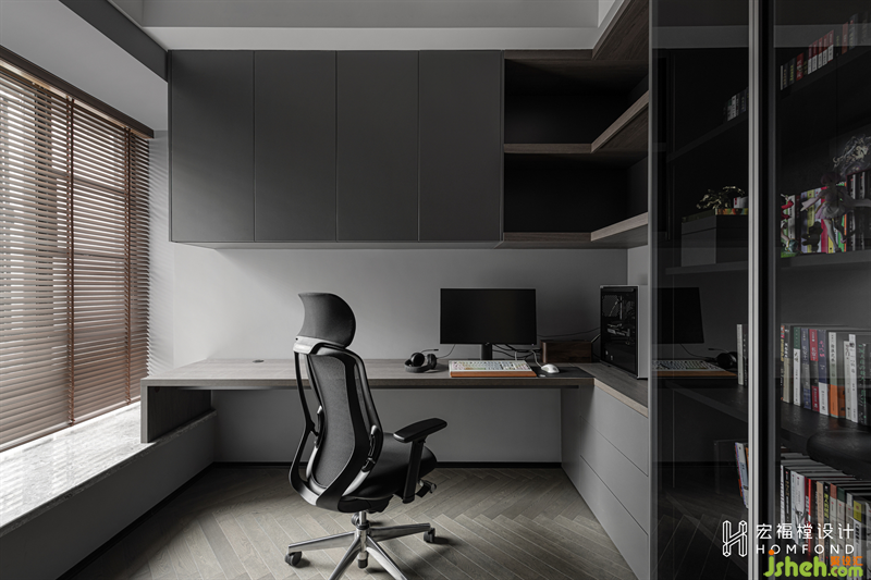 書房整體大氣時(shí)尚,體現(xiàn)了屋主沉穩(wěn)、不拘一格的氣質(zhì)品味。細(xì)長型的結(jié)構(gòu)中,打造出一個(gè)兩層夾角收納區(qū)域恰好能滿足屋主居住日常的使用需求。