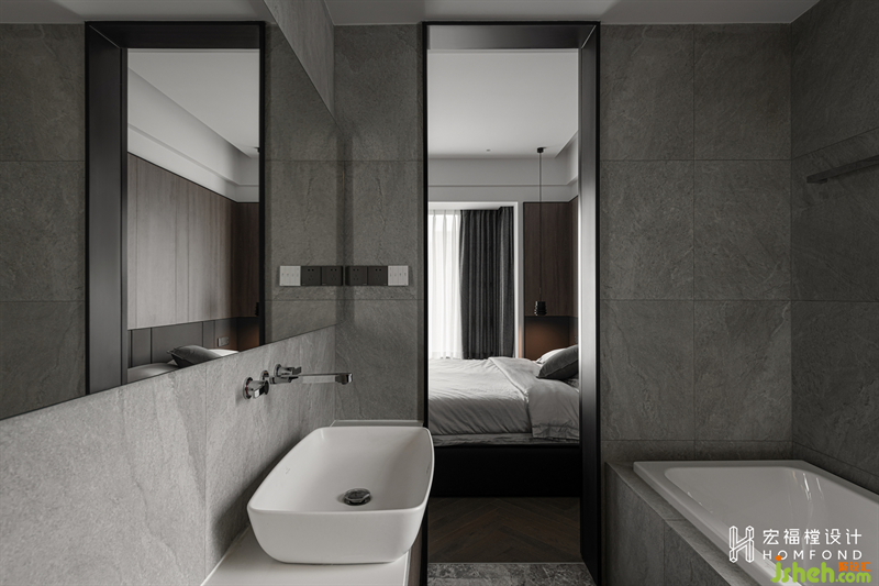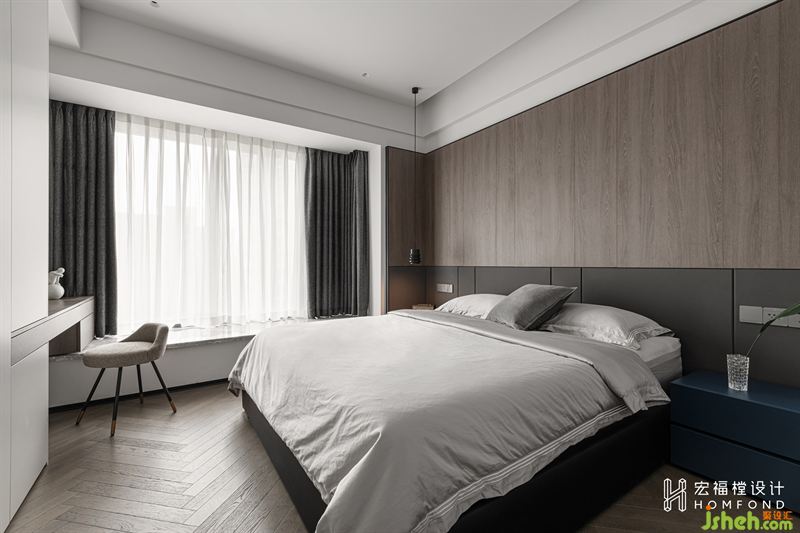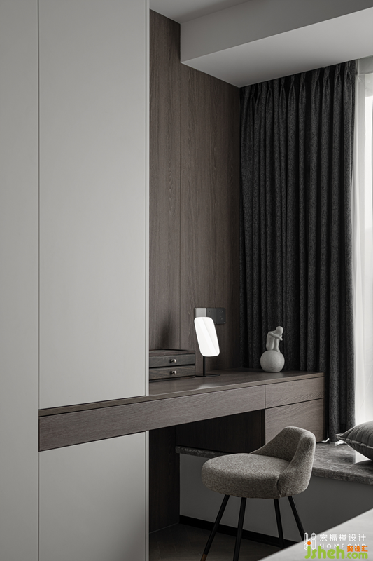 空間延續(xù)極簡灰作為主色調(diào),淺色緞面床品提升整體調(diào)性,去繁就簡,營造舒緩靜謐的入睡氛圍。天然木飾面的加入,為空間注入自然生命力,回歸純粹的居住屬性。