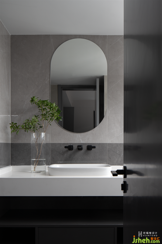 煙灰色、鋼灰色、亮白色、魅影黑組合拼貼出清爽純凈的色塊空間,鏡面以橢圓造型弱化四邊形過多而造成的硬朗感。多種元素融合呼應(yīng),得以煥發(fā)出新的能量。