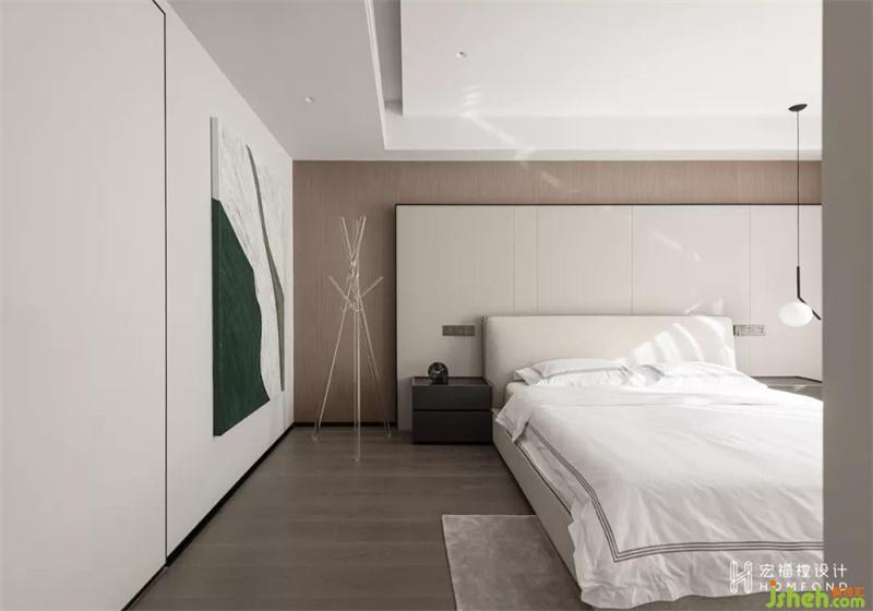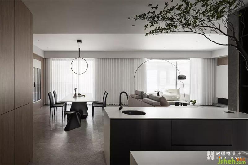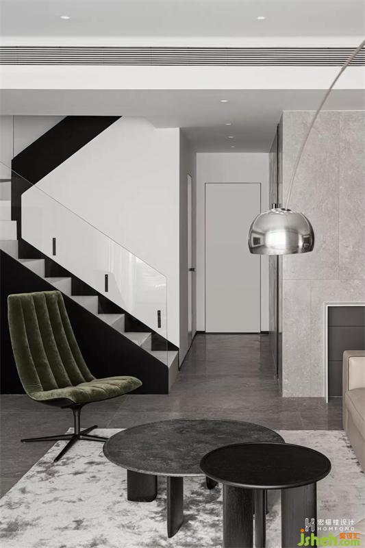 在形成秩序的同時(shí),也賦予空間絕對(duì)的廣闊性?,F(xiàn)代與生活經(jīng)過(guò)融合思考,藝術(shù)也囊括進(jìn)入其中,空間中垂直的對(duì)稱、縱深的弧線,形成屬于這間居所的獨(dú)特語(yǔ)言。