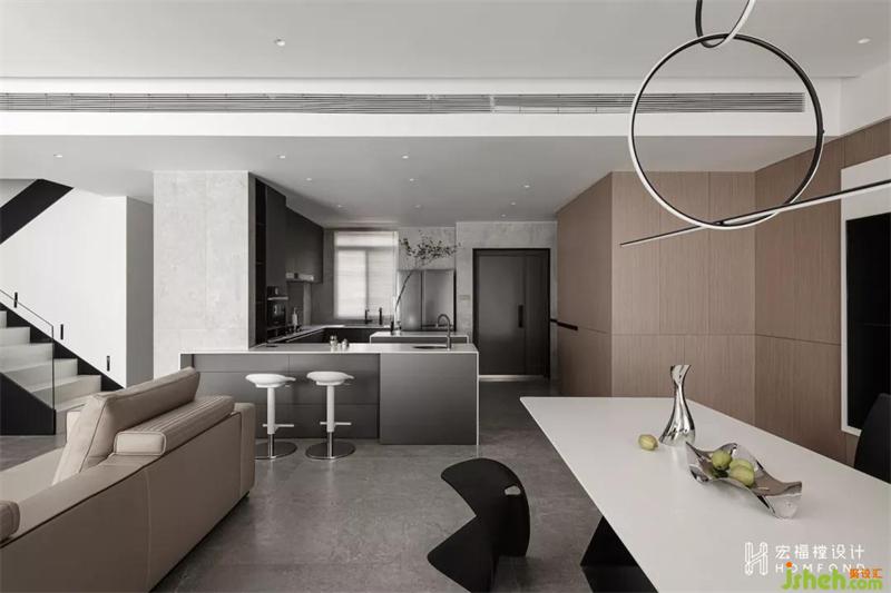 空間前后形成多種虛實(shí)關(guān)系,利用凸顯與隱后的設(shè)計(jì)手法將餐廳展示柜以懸空的視覺(jué)方式呈現(xiàn),給人以輕盈之感。開(kāi)放后的廚房與餐廳動(dòng)線,讓平日的生活互動(dòng)變得更生動(dòng)。