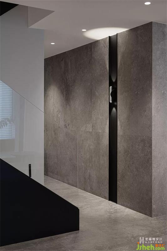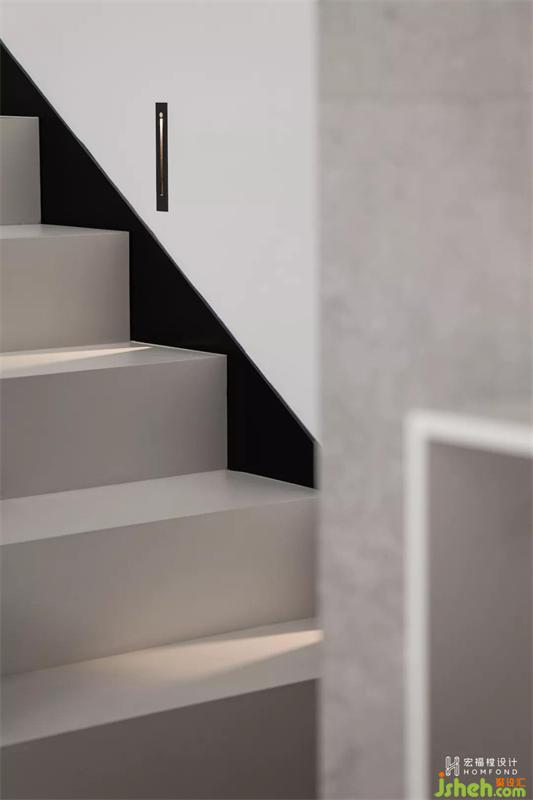 樓梯在反向改造過(guò)后,擴(kuò)大梯間視野,面向公共空間。延伸廚房墻磚材質(zhì)至走廊墻體,去掉過(guò)于用力會(huì)產(chǎn)生的繁雜效果,打造出更符合屋主的空間感染力。