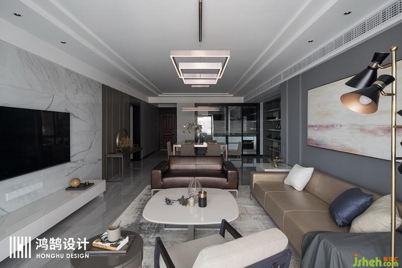 設(shè)計公司利用簡潔的家具,別致的吊燈、落地?zé)?,讓這個客廳有種低調(diào)的奢華感。