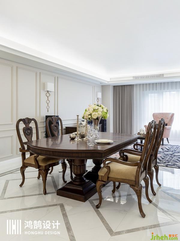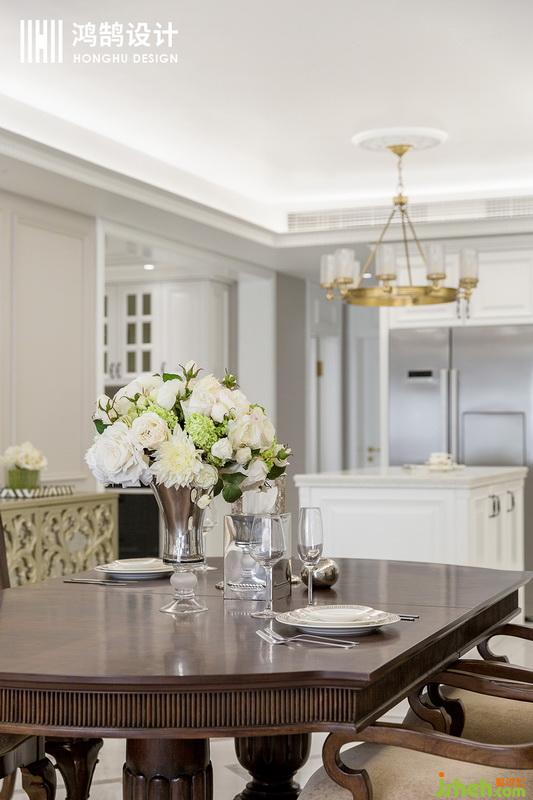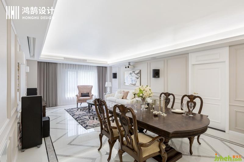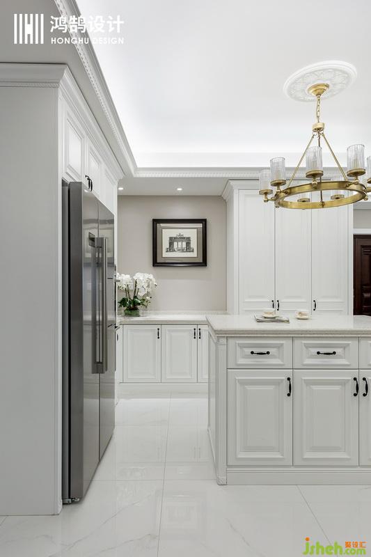 說起法式,大家可能會(huì)和美式的設(shè)計(jì)有所混淆,但其實(shí)在風(fēng)格上,法式相比較美式更講究中軸對(duì)稱,看起來更加恢弘大氣。在細(xì)節(jié)上,法式會(huì)有一些雕刻,顯得更加精致,此案例中吊燈的雕刻設(shè)計(jì)以及吊燈的選用,是很能突出法式設(shè)計(jì)的大氣與浪漫。