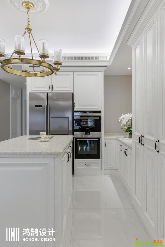 由于本身廚房空間較小,所以室內(nèi)設(shè)計(jì)師在設(shè)計(jì)的時(shí)候?qū)⒃鹊膹N房設(shè)計(jì)成了開放式西廚,并且設(shè)計(jì)了中島,在這個(gè)空間里,設(shè)計(jì)師將美觀與實(shí)用相結(jié)合,運(yùn)用了很多柜體,這樣的設(shè)計(jì)既能體現(xiàn)出法式的風(fēng)格,也能將空間利用的恰到好處。