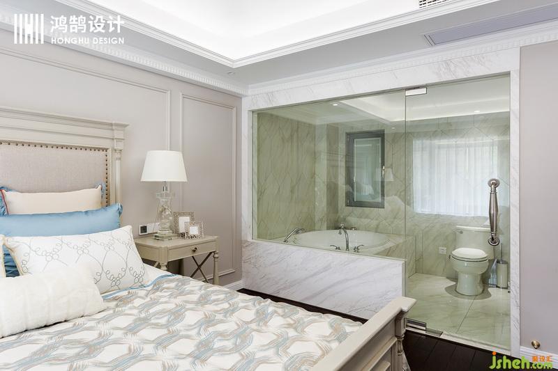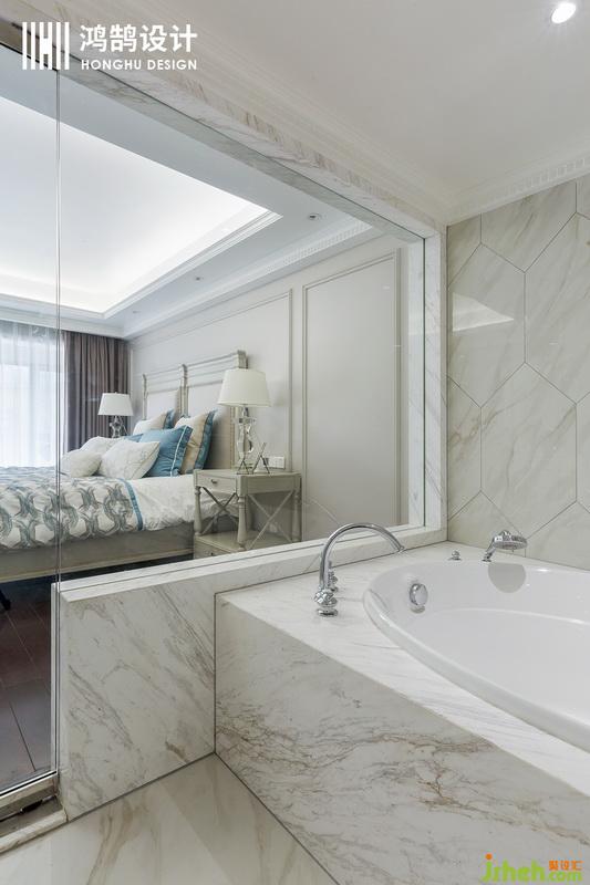 用了透明的玻璃材質(zhì)作為主臥衛(wèi)生間的隔斷,讓光線無阻擋的照進整個房間,使得房間更通透。