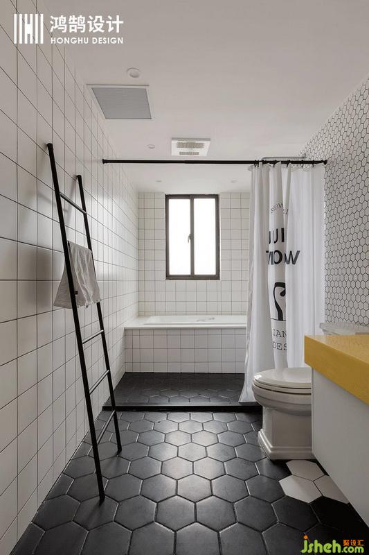 內(nèi)衛(wèi)的設(shè)計(jì),作為衛(wèi)生間控的小編真的是非常喜歡了。無論是大小的六角磚還是小四邊磚,黑白鑲嵌,美縫設(shè)計(jì)更是超現(xiàn)代。無論從工藝上還是設(shè)計(jì)上都是非常用心的計(jì)劃。室內(nèi)設(shè)計(jì)師沒有用常規(guī)的毛巾架,而是采用階梯架子,既美觀,又實(shí)用!