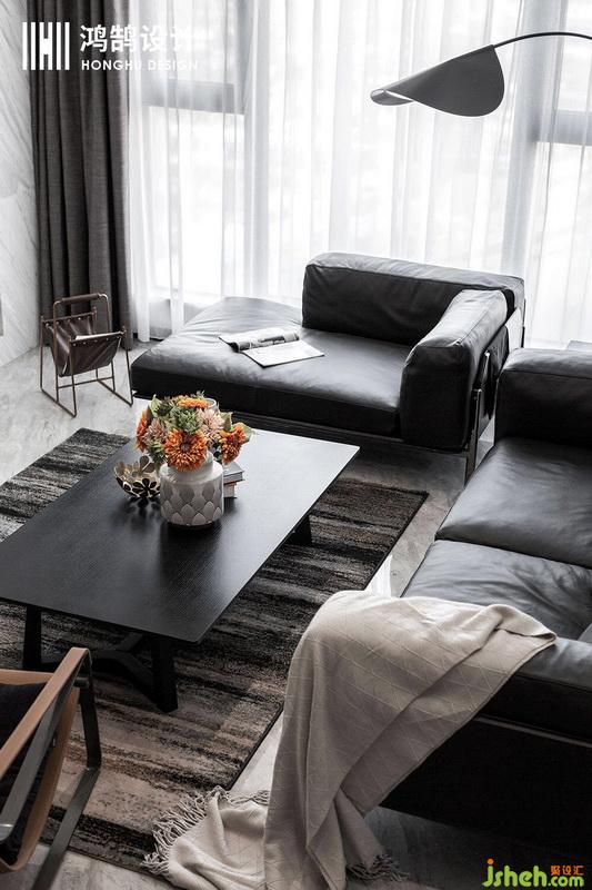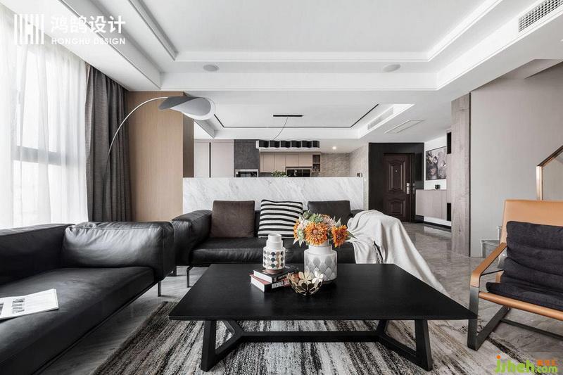 白色的紋理大理石作為客廳空間的主要材質(zhì)裝飾空間,既大氣又簡潔。用黑色的皮質(zhì)沙發(fā)作為客廳的軟裝,搭配非常巧妙,用黑色的剛硬感,去撐起空間的質(zhì)感,讓大面的白色大理石,顯得非常飽滿。