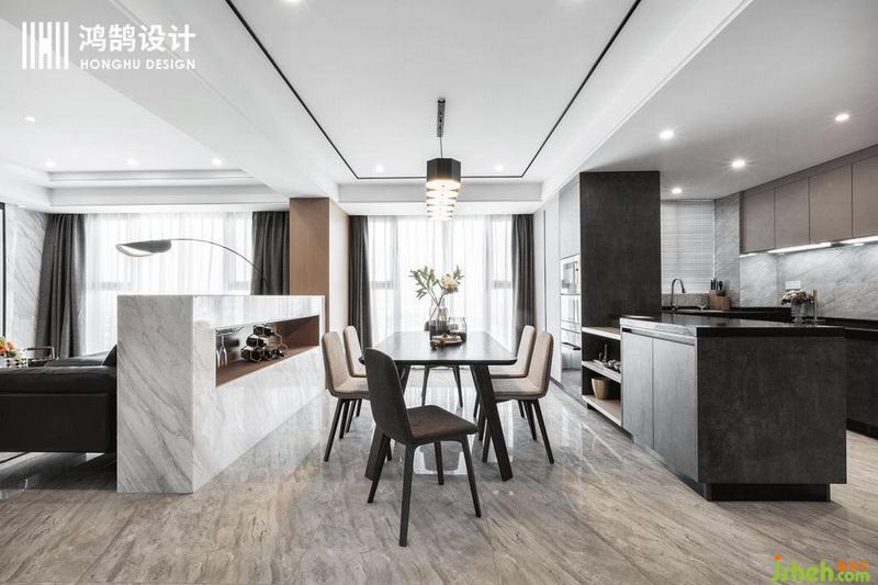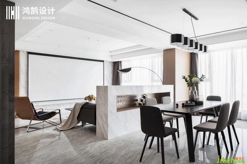 延續(xù)白色大理石作為主要材料,室內(nèi)設(shè)計師運用這個元素,作為隔斷客餐廳的吧臺,與投影的背景墻相呼應(yīng),讓整體客廳變得非?,F(xiàn)代,且不乏享受生活的浪漫質(zhì)感。