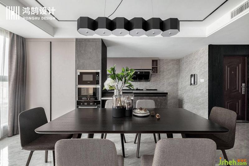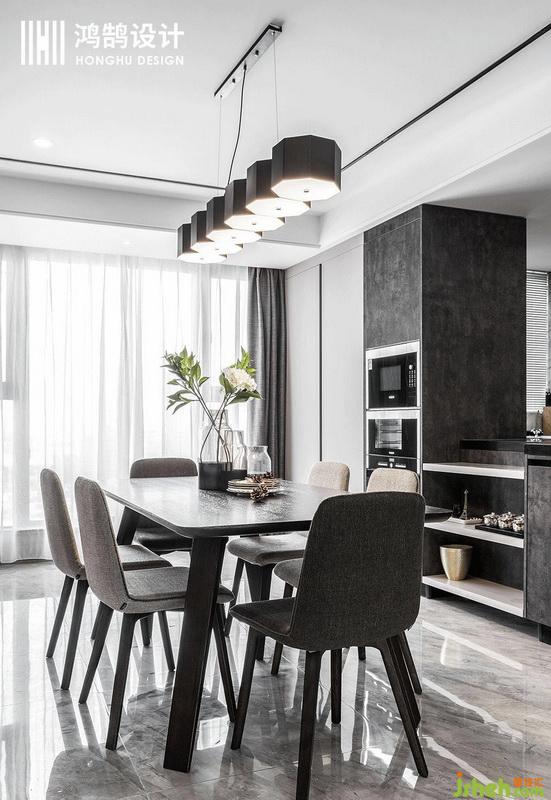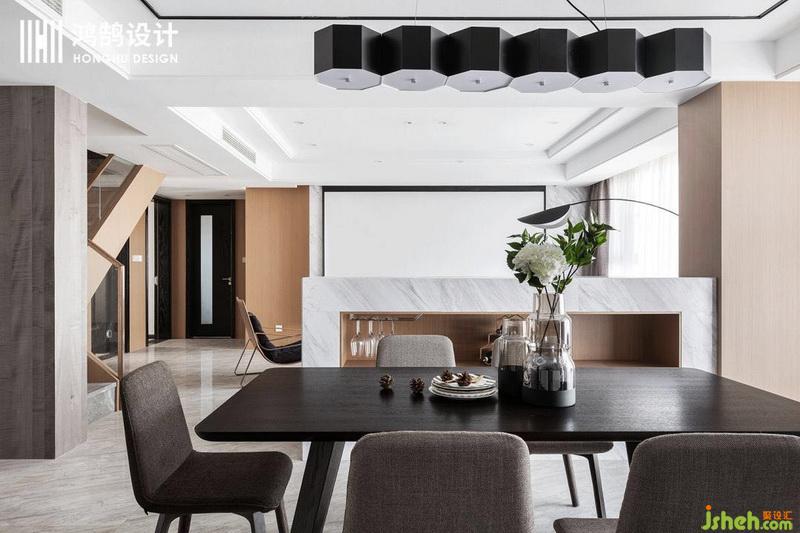 餐廳的設(shè)計上,并沒有太多的復(fù)雜的造型,而是簡單的形狀吊燈搭配深棕木質(zhì)的餐桌,勾勒的是簡單美好且不乏生活情趣的家居生活。