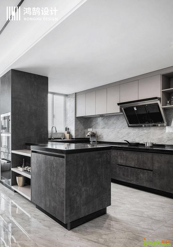 廚房的設(shè)計也是延續(xù)現(xiàn)代風(fēng)格,運用深灰色櫥柜側(cè)板 作為主要的廚房空間材質(zhì),百葉窗的光線照進廚房,我們已經(jīng)能想象,這個空間里面,男女業(yè)主享受生活的朝朝暮暮。