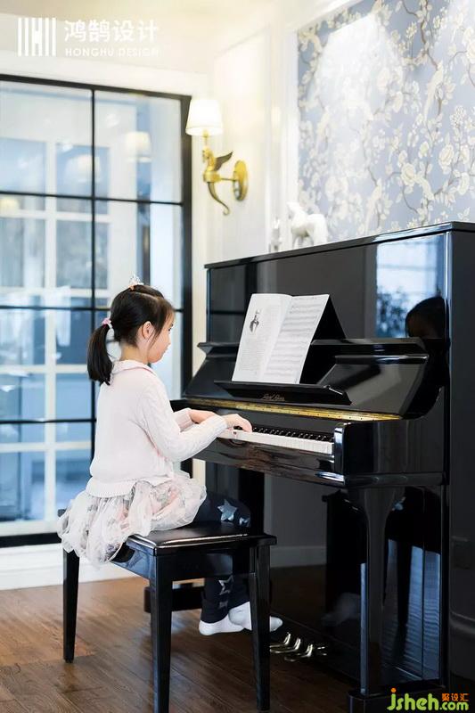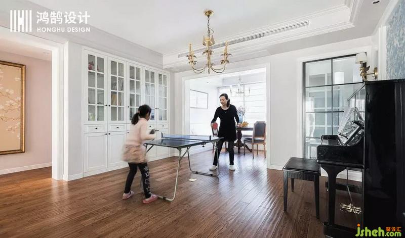 這個(gè)活動(dòng)室是本案的亮點(diǎn)之一,設(shè)計(jì)公司將原餐廳的大空間 放置著乒乓桌和鋼琴 ,形成親子互動(dòng)的親密空間 ,大面積的暖色乳膠漆從墻面一直刷至頂面線條處 拉升了整體空間的層高。這樣的設(shè)計(jì)也是女主的要求,她希望陪伴女兒的每日的成長(zhǎng),讓家里多些孩子的足跡。