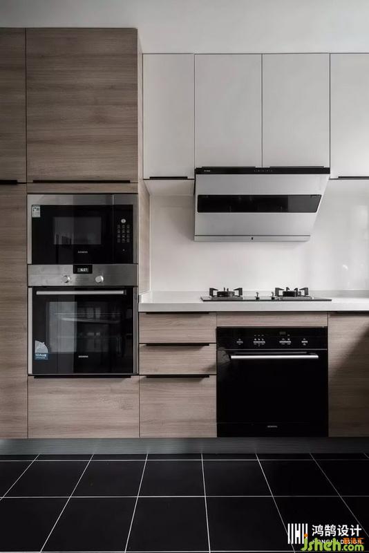 廚房門板的顏色與房屋整體的木飾面顏色是統(tǒng)一的,包括所有柜體的門把手都是黑色鐵藝材質(zhì),再次強調(diào)了整體風(fēng)格的統(tǒng)一性。廚房地面室內(nèi)設(shè)計師采用了黑色啞光的瓷磚鋪貼,與部分柜體和電器相互呼應(yīng),顯得更加沉穩(wěn)有格調(diào)。