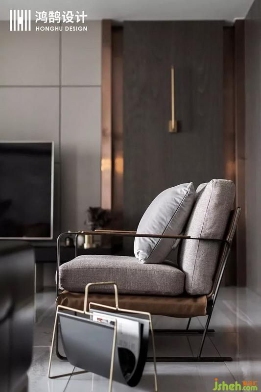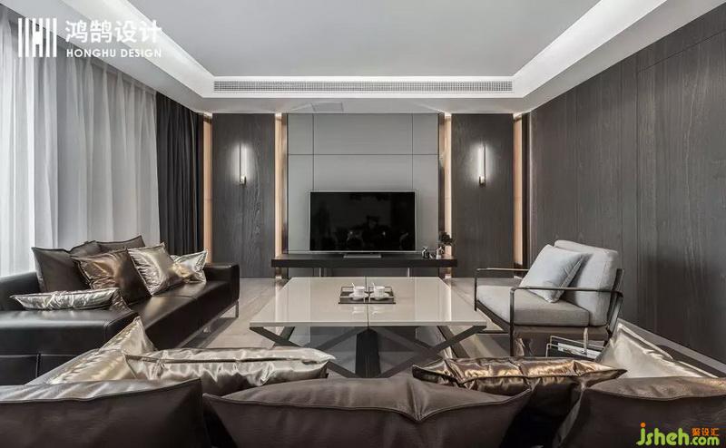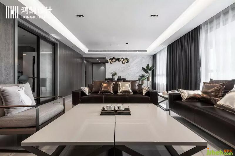 客餐廳為一個通長的空間采用中軸對稱的布局方式,讓空間顯得更加的開闊,用材上采用了木材、金屬、皮質三種材質的穿插,表達現代輕奢的質感跟層次。