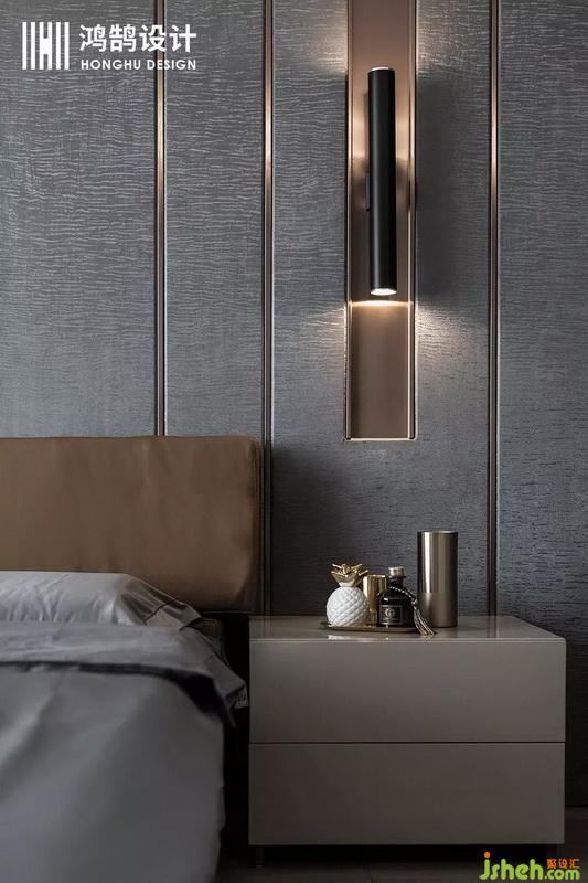 主臥室是一個通長的比較開闊的臥室跟書房空間,在就寢區(qū)設計公司采用三邊圍合的床背景來劃分區(qū)域讓人有安全感,用材上采用了深色硬包增加臥室的神秘感,用金色的金屬點綴提升空間層次和質感。