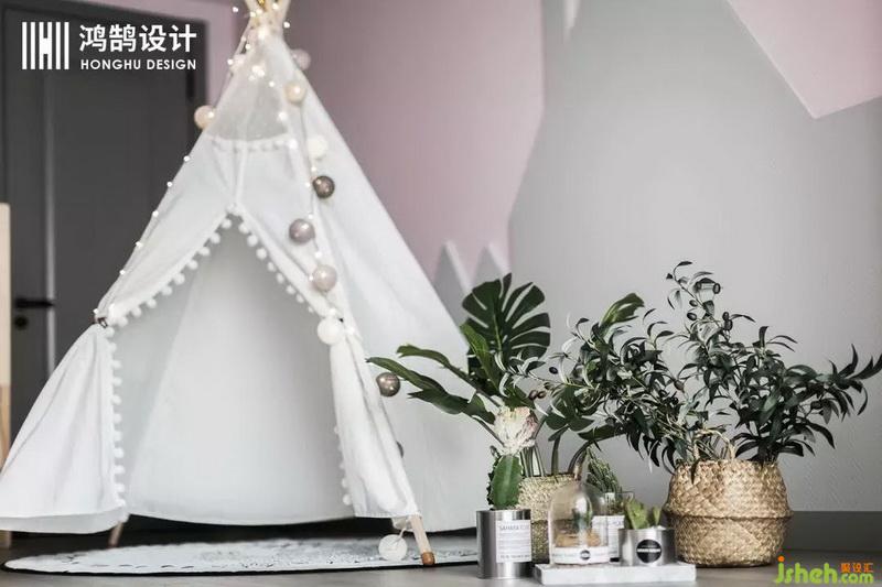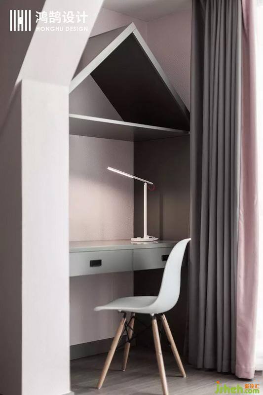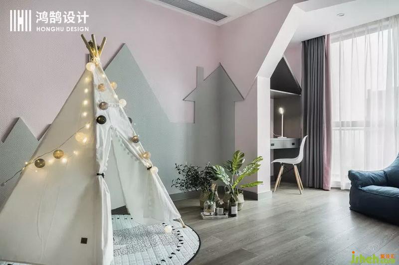 兒童房把原本的陽(yáng)臺(tái)和臥室打通,原本的陽(yáng)臺(tái)做為學(xué)習(xí)區(qū),整體的風(fēng)格為北歐ins風(fēng),設(shè)計(jì)公司采用灰粉的顏色搭配,利用房子草地這樣一種概念做出來比較有趣的造型??臻g看起來更連貫流暢也有主題性。