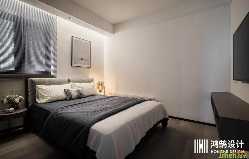 主臥的床頭,再次看到了木飾面板的運用,設(shè)計師用木飾面代替床頭,再購買獨立床架,這樣設(shè)計的好處是統(tǒng)一性更強,缺點是要多幾個枕頭,靠著才舒服。