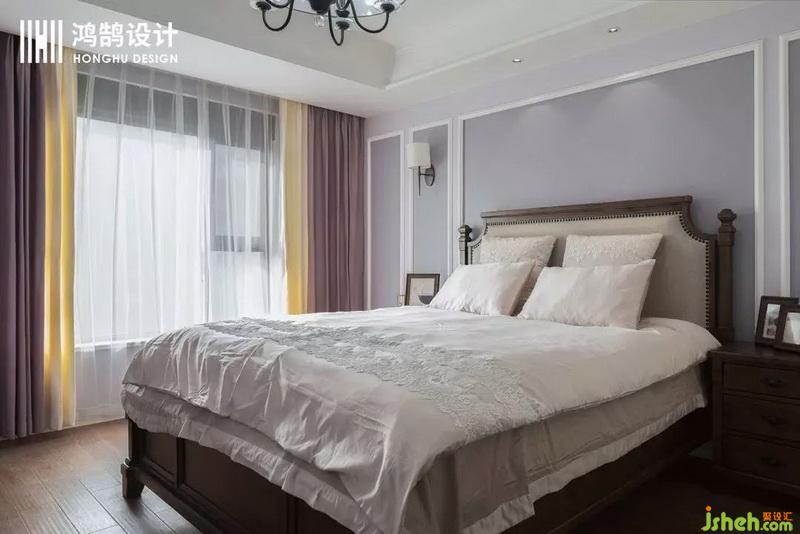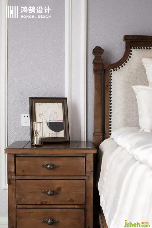 深棕色的原木床,在香芋紫的映襯下,改變了原本的呆板,多了幾分溫潤(rùn)。