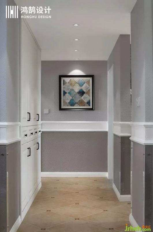 設計公司在處理過道時也是別有用心,將業(yè)主的儲物功能做了一個很好得規(guī)劃,將過道墻體嵌入儲物柜,將儲物柜正好設計在衛(wèi)生間對面,既能作為公共儲物柜,也能將衛(wèi)生間一些雜物放置于其中,便于取放。