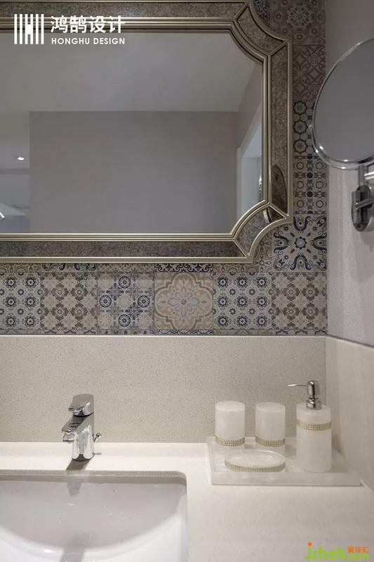 金邊復古鏡,搭配花磚上墻,經典復古的美式,在衛(wèi)生間的角落都體現(xiàn)的至善至美。 設計公司