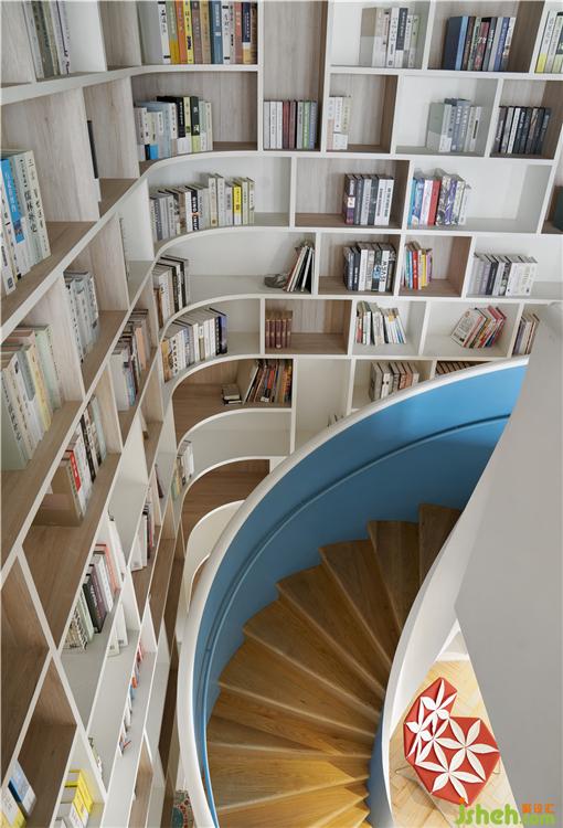 別墅設(shè)計(jì)從一樓整壁延伸到二樓的巨幅書架,圍繞著樓梯布局,木色和白色的木格,大大小小錯(cuò)落而設(shè),與樓梯色彩形成呼應(yīng),自帶跳躍的節(jié)奏感。貫穿二層樓的樓梯。帶有韻律感的弧線盤旋而上,白色的外輪廓卷著海藍(lán)色的底色翻涌而上,四周圍繞著書海,意境就很美。