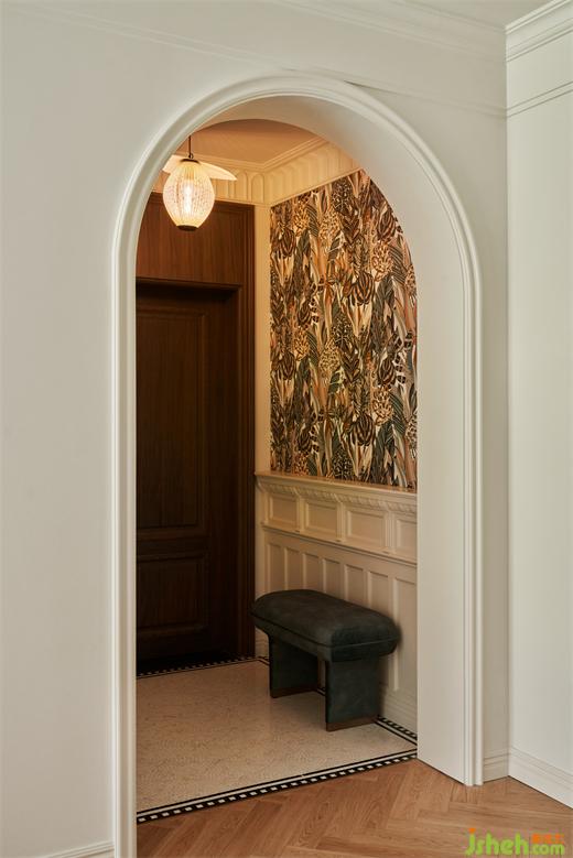 入戶門廳充滿了儀式感和復(fù)古情懷,給室內(nèi)外的轉(zhuǎn)換提供了一個很好的過渡作用,在溫暖的燈光下,胡桃木色的暈染,呈現(xiàn)出時光的靜好,簡單而自然,沉著而冷靜。