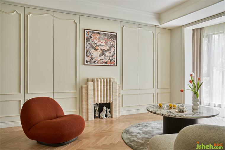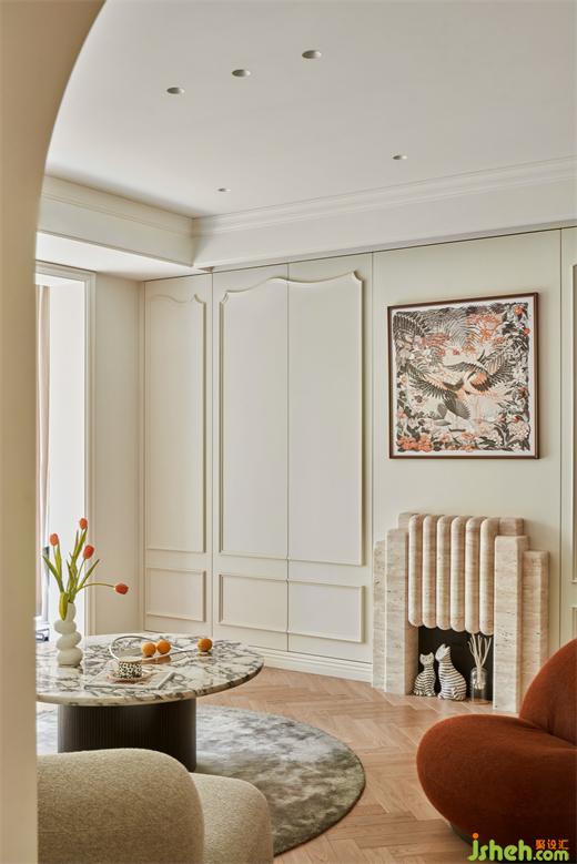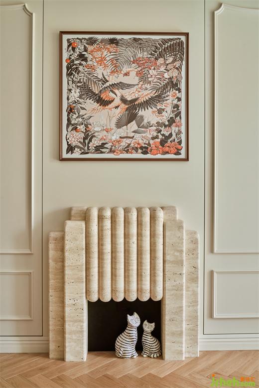 在客廳的背景處,設(shè)計師打造了一個儀式感很強的法式壁爐,為了呈現(xiàn)出自然與復(fù)古的韻味,用天然的洞石來做壁爐的造型,并用連貫的小曲線弧度來深化造型的柔美與優(yōu)雅,從而更好地與空間主題相契合,并成為空間中一個獨特的視覺中心。