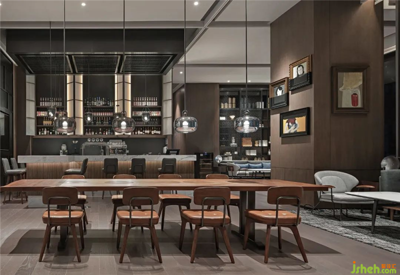 大堂側(cè)面的HOLA bar打造了一個(gè)集咖啡、精釀、文化等現(xiàn)代生活方式于一體的多元共享社交空間,是商務(wù)、休閑、移動(dòng)辦公的個(gè)性之選。設(shè)計(jì)融合了工業(yè)型格與復(fù)古輕奢創(chuàng)意元素,將復(fù)古重現(xiàn),結(jié)合當(dāng)?shù)爻啥嘉幕?,以小景?xì)節(jié)呈現(xiàn),打造輕松現(xiàn)代感的社交場(chǎng)所,為“旅享家”打造新型社交體驗(yàn)。