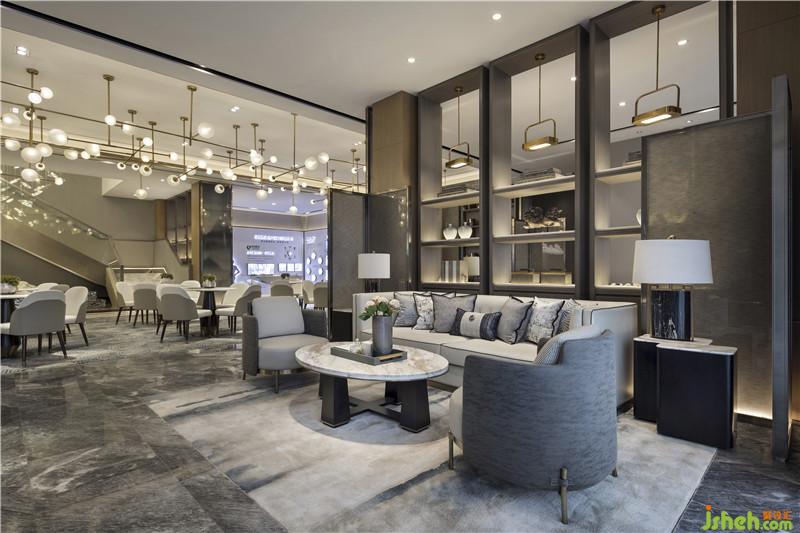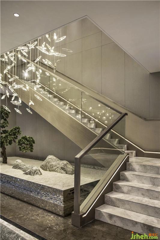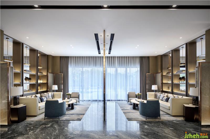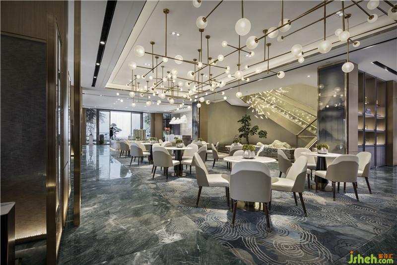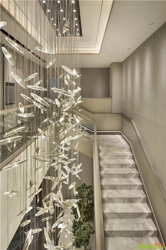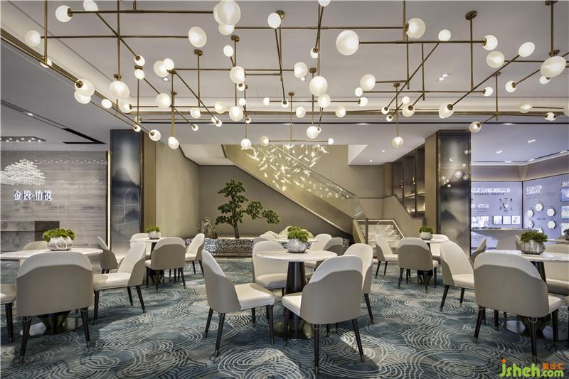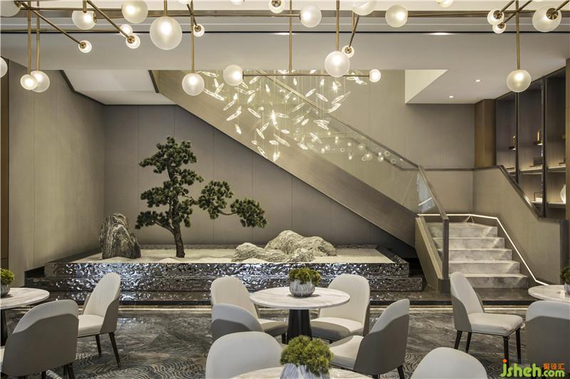 “萬丈洪泉落,迢迢半紫氛。奔流下雜樹,灑落出重云。日照虹霓似,天清風(fēng)雨聞。靈山多秀色,空水共氤氳。”銀泉飛瀑跌宕而下,鏗鏘有力,疾風(fēng)驟雨,亦真似幻。騰空而起的縹緲?biāo)畾?,煙霧繚繞,一派迷蒙與虛無之境?!疤斓仉硽?,萬物化醇”,提取廬山瀑水之韻、之形、之氣、之神,鋪灑在空間各個角落,孕育乾坤交合的生命意境。設(shè)計公司