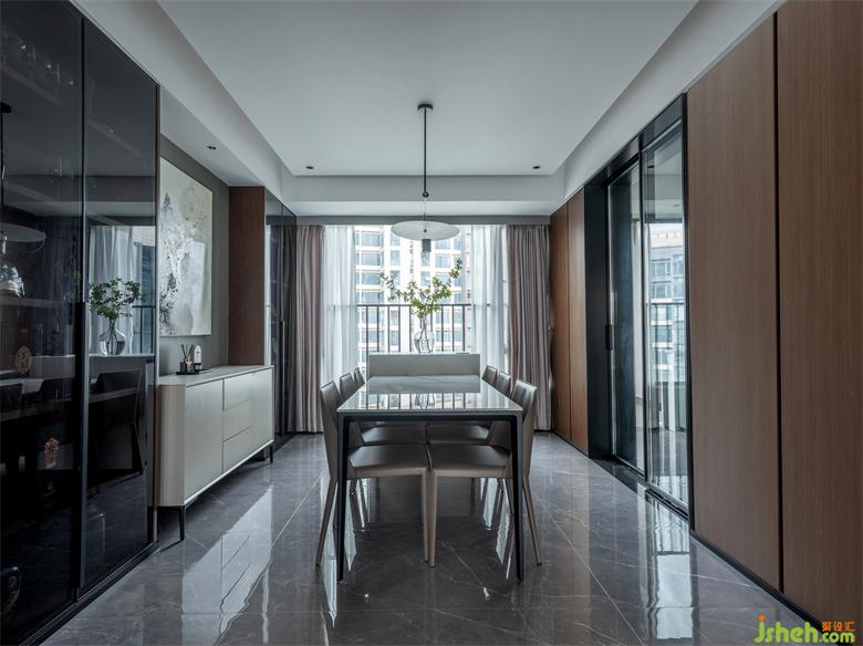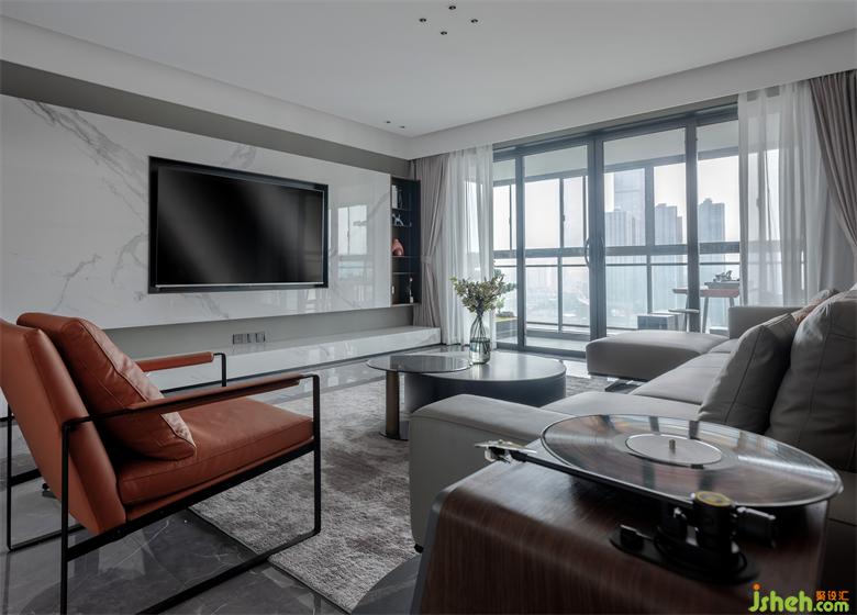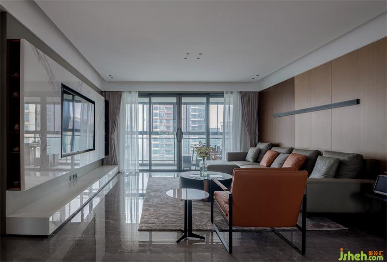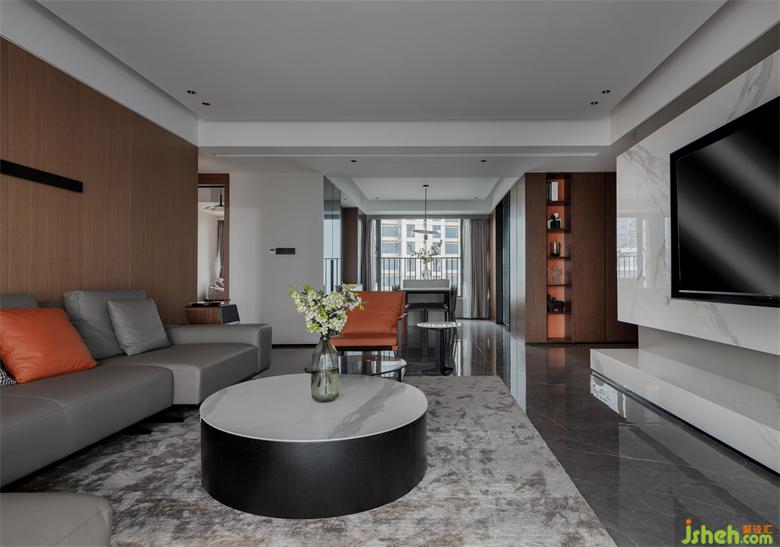 客餐廳設(shè)計拋棄了傳統(tǒng)設(shè)計中亮麗通俗的流行色,豪宅設(shè)計選用了低飽和度的“高級灰”和大面積“暖灰”,以及局部愛馬仕橙作為畫龍點睛之筆。