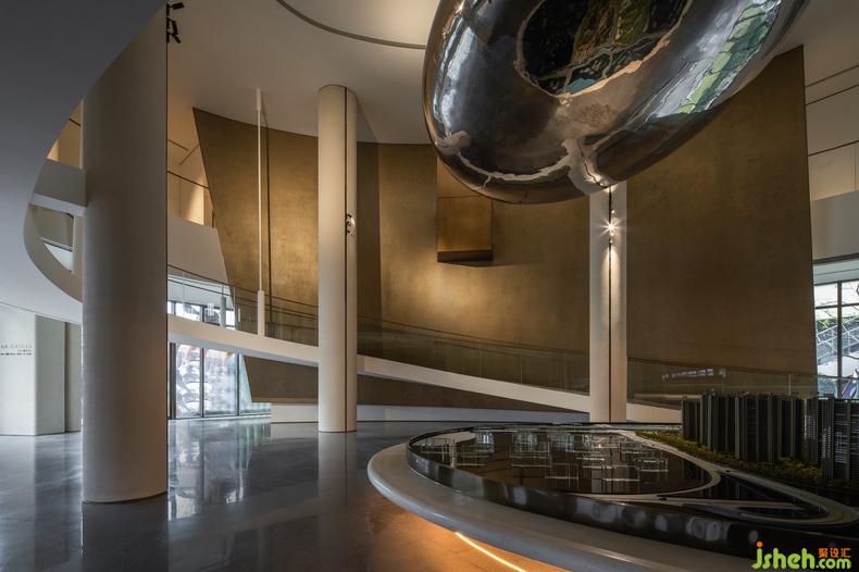 浮起、落下,而又回升,沙盤區(qū)以雙向壁面的向內(nèi)圍構(gòu)形成了感知上的絕對尺度,巨大而透亮的不銹鋼球體,體驗中心設(shè)計以材質(zhì)與造型本身的夸張科技感成為空間視覺的焦點,自上穿越兩層空間的高度垂吊懸空,與中心沙盤互為映照室內(nèi)設(shè)計師