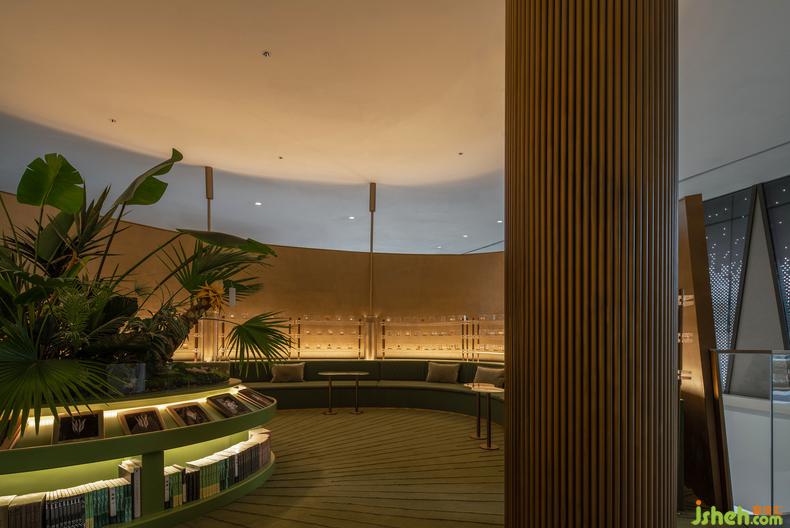 矮櫻的柔嫩、香薊的堅毅、銀杏的治愈......亞克力壓印的葉片標(biāo)本,在局部燈光的映照中,將人們游覽的視線聚焦。復(fù)古的墨綠色調(diào)與黃銅材質(zhì),連通整體空間的設(shè)計語言,在此刻,獨享時光的靜妙。