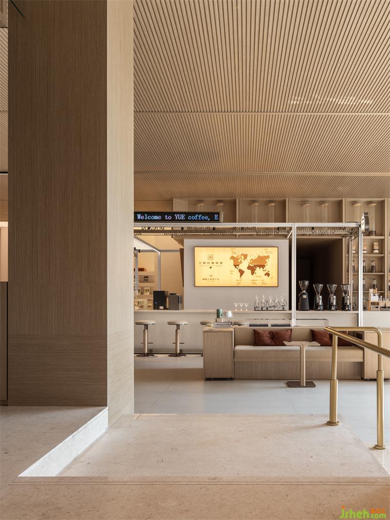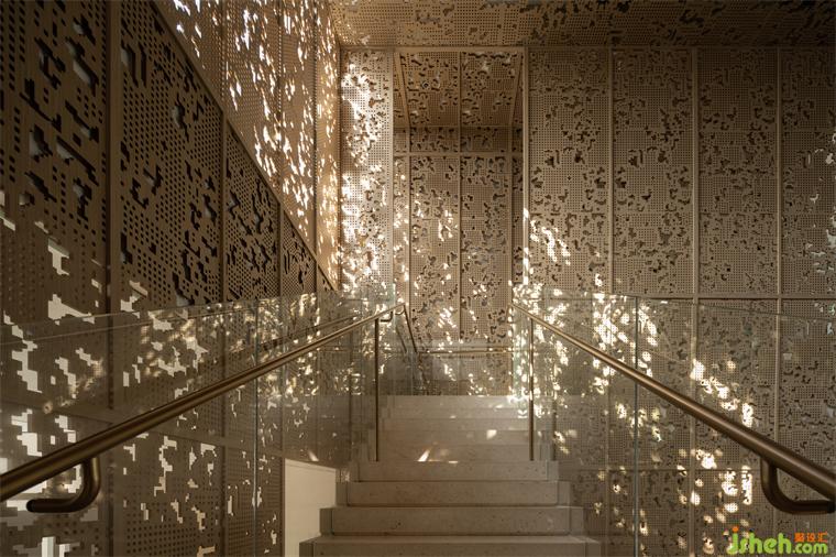 主要材料:淺色石材,木飾面,雕花柵格,肌理涂料,古銅鋼