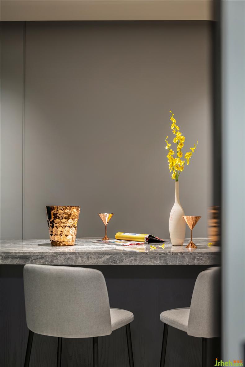 The concept of dining bar refers to the combination of characteristic dinner and leisure atmosphere. Marble table and high stool make eating and drinking a "one table" thing.