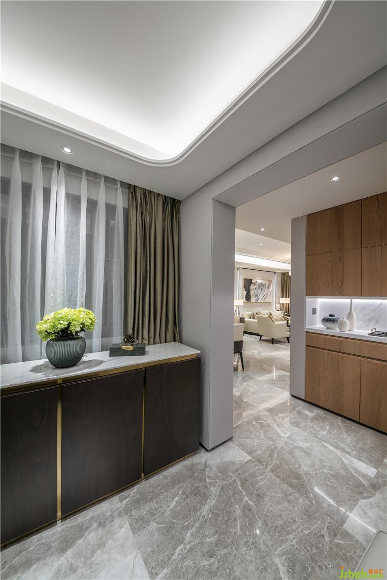 玄關(guān)用深色與鋁合金的搭配凸顯了質(zhì)感,半遮掩的玄關(guān)有著一股中國風(fēng)的韻味。
