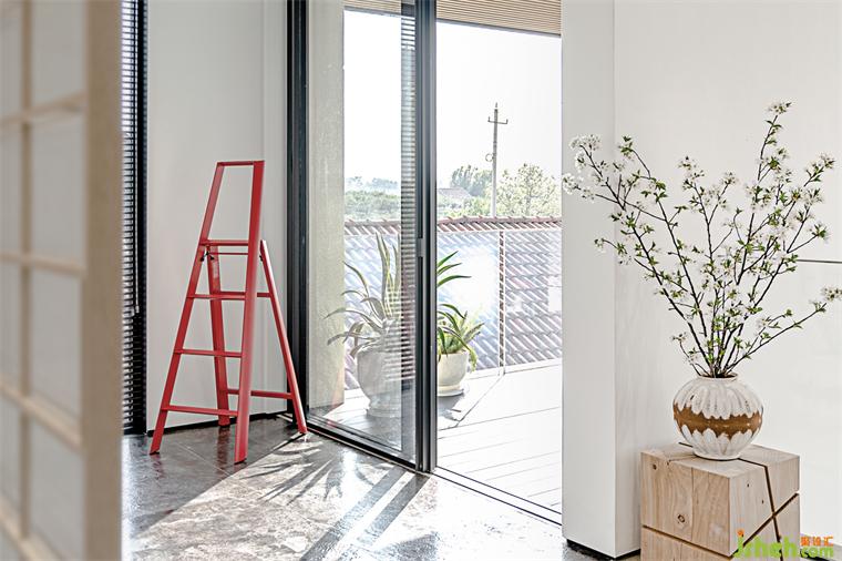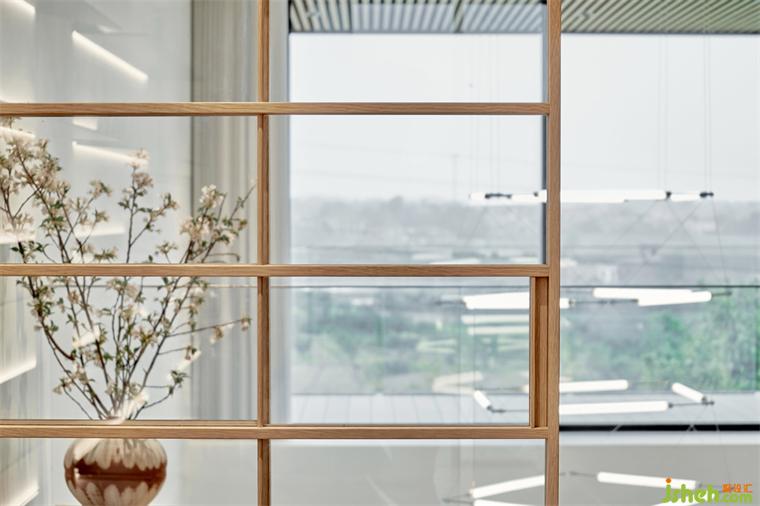 步入二層長廊,舒適溫潤的氣質(zhì)延續(xù)演繹。連接書房和樓道的木格柵,以鏤空設(shè)計控制光線的明暗,輕盈清透的玻璃,引借自然光映亮居室。