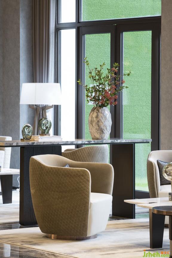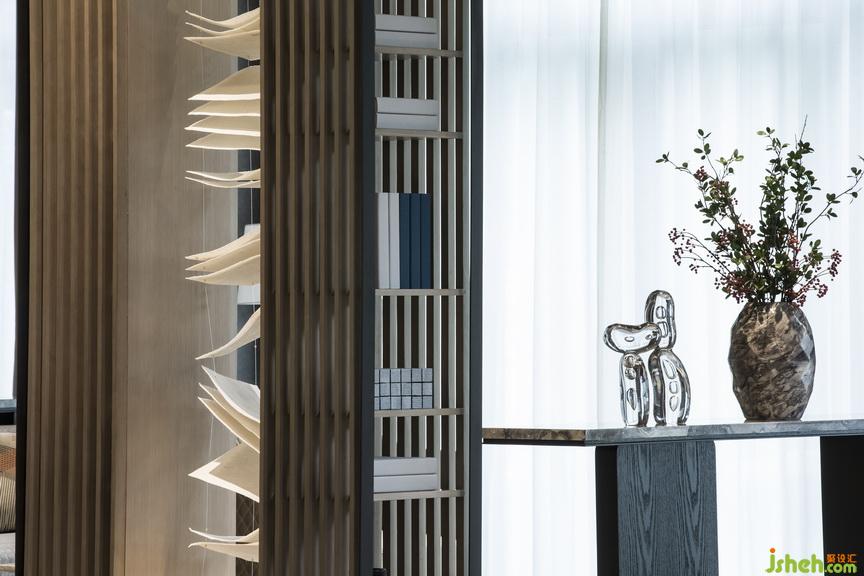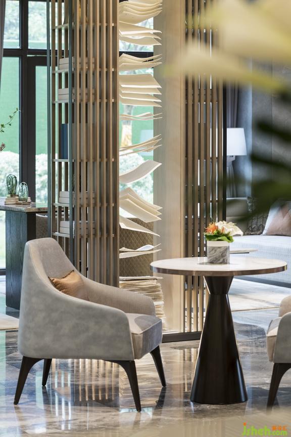 沿建筑內(nèi)部的外圍設置大面積落地窗,將室外的自然景觀與室內(nèi)空間相融合,形成內(nèi)外共通的局面,從視覺角度放大空間。落地窗周圍采用隔柵打造天花,通過材質(zhì)的不同劃定功能分區(qū)。黑色旋轉(zhuǎn)樓梯采用拼裝概念,提升空間的現(xiàn)代感,同時置入小型水滴形裝置吊飾,形態(tài)、材質(zhì)及大小的對比使空間達到視覺美感的平衡狀態(tài)。休憩區(qū)將裝置藝術、書架和隔斷三種功能結合,達到實用性與藝術性的共融。仿照書頁的藝術裝置以材質(zhì)的輕盈感模擬漂浮意境,提升空間的靈動性與透氣性。室內(nèi)設計師