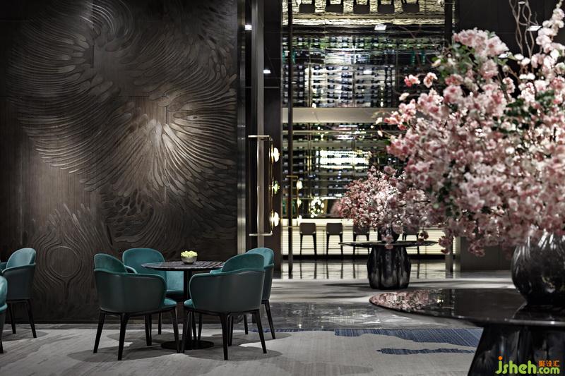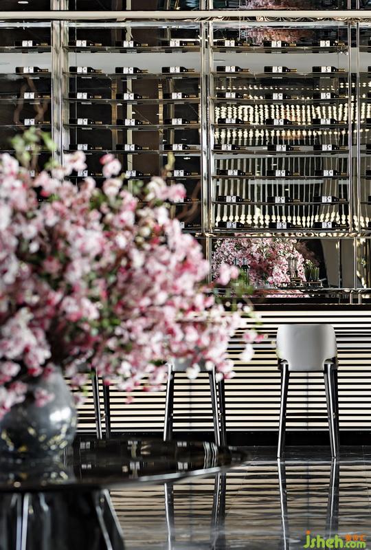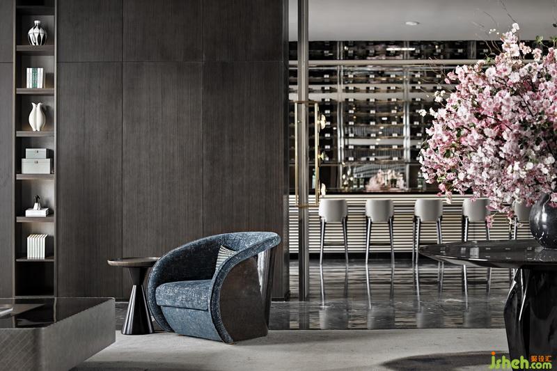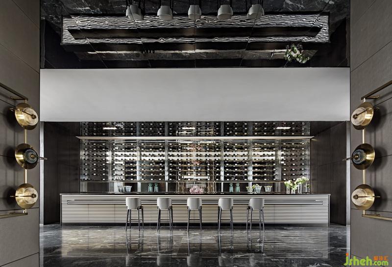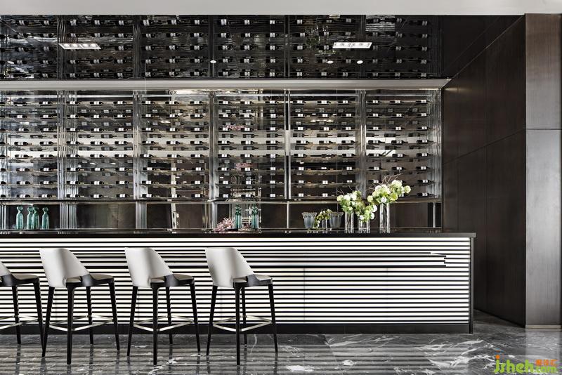 水吧臺通過概括提煉的方式增強(qiáng)空間形式感,室內(nèi)設(shè)計師利用線性陣列與陳設(shè)元素的拼接傳達(dá)出肅靜、前衛(wèi)的時代氣質(zhì)。