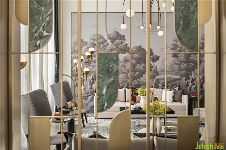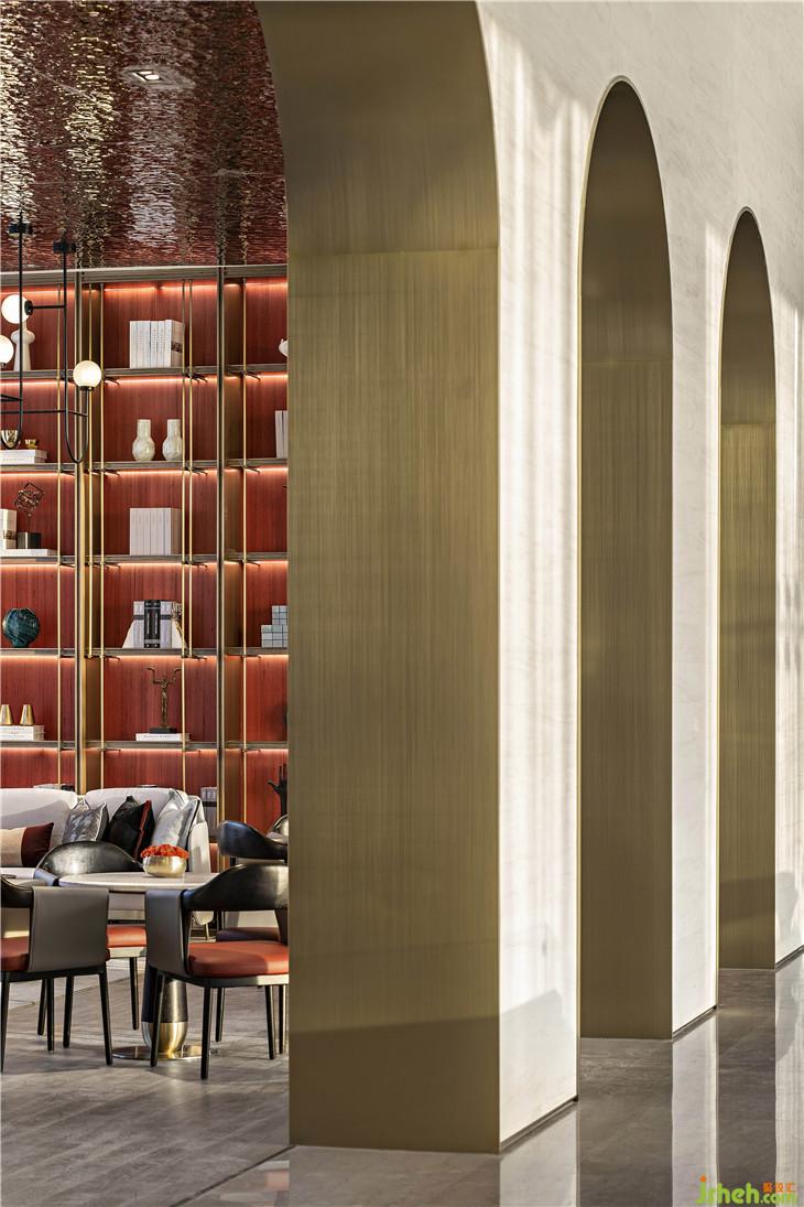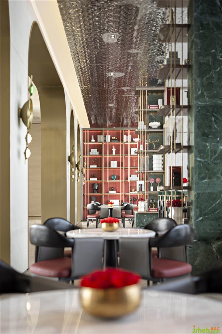水吧區(qū)呼應(yīng)了翡翠主題,零星翡翠綴滿幾何裝置,以點、線構(gòu)筑面的意象,愈是簡單,愈是呼喚起人與自然的靈魂共鳴。設(shè)計師以幾何元素凝聚空間,傳達(dá)美學(xué)奢華的生活態(tài)度。